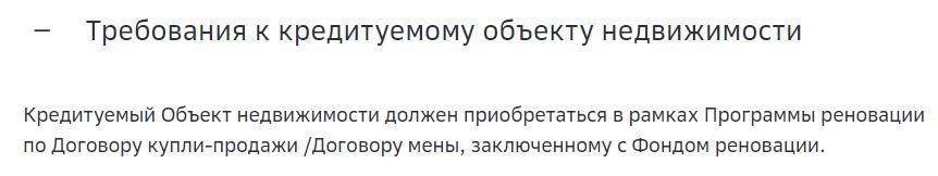- Кредит выдается исключительно на приобретение жилья в рамках программы реновации;