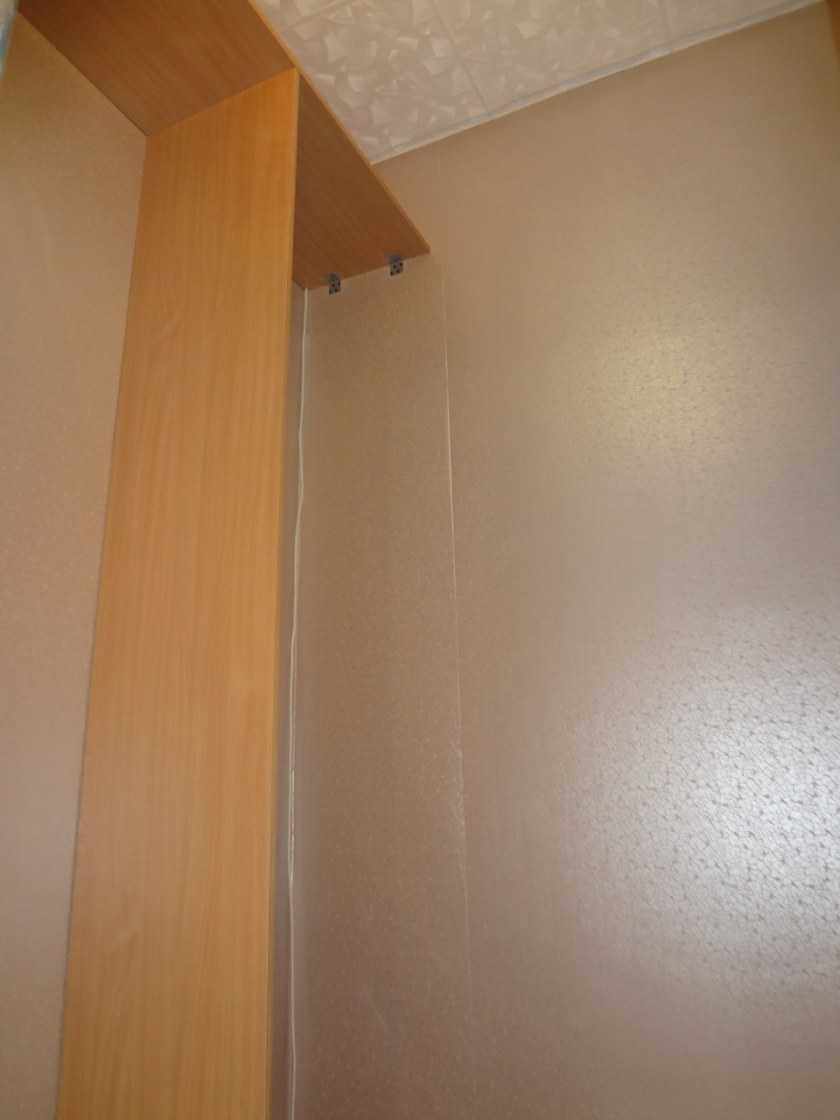 На подобной маленькой части пространства можно поместить лишь несколько полок, где, например, будет храниться одежда. Для белья следует дополнительно оборудовать полочки.