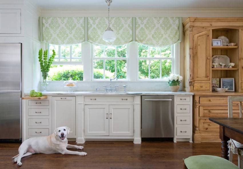На фото оформленных окон кухни часто можно увидеть использование ламбрекенов, которые применяются не только в классических, но и в современных интерьерах. Ламбрекены делятся на жесткие, которые называются бандо, и на мягкие. Особенностью мягкого ламбрекена считается тот факт, что ткань в нем собирается в складки и украшается с помощью драпировки из волн или рюшей. Часто ламбрекены используются в сочетании с гардинами и тюлем или выступают самостоятельным элементом, который чаще применяется для того, чтобы скрыть карниз.