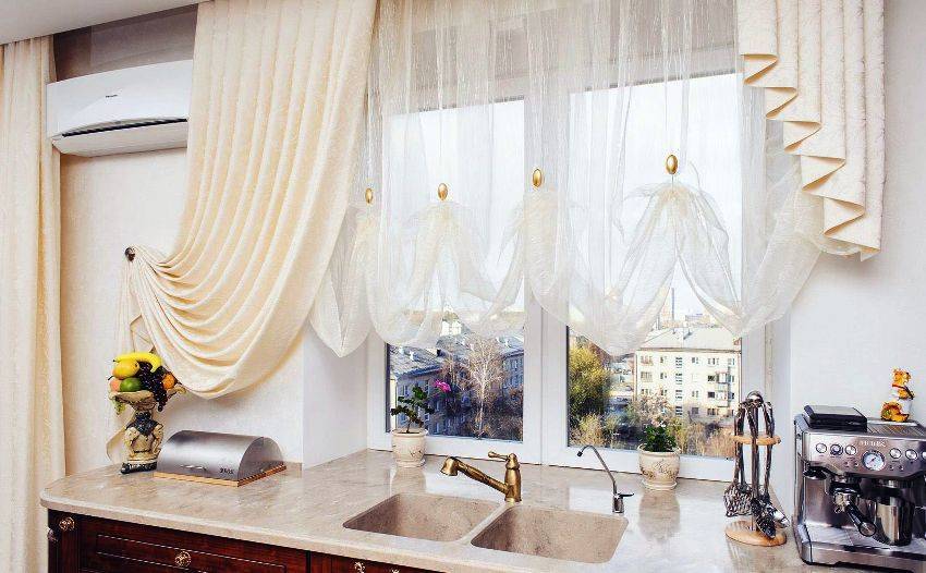 Комбинированный ламбрекен сочетает в себе жесткий и мягкий варианты, выглядит богато и солидно. Такое оформление лучше оставить для просторной кухни в стиле барокко, модерн или для классического помещения. Нужно помнить, что многослойные шторы на кухне считаются неподходящим вариантом в плане противопожарной безопасности. Поэтому многослойные портьеры должны находиться далеко от газовых плит.