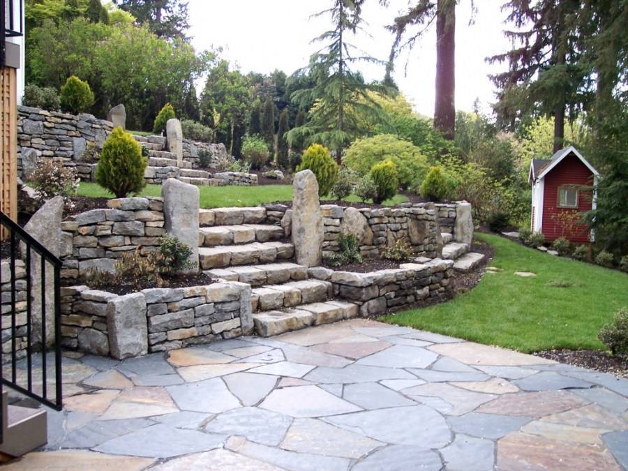 Если нужен огород или цветник, а также ягодные и декоративные кустарники, то на крутом склоне придется делать плоские террасы, укрепленные каменной кладкой. В дизайне участка со склоном террасы должны быть связаны между собой ступенями — не следует делать пологие дорожки от террасы к террасе, поскольку в дождливую погоду, а также при гололеде ходить по таким дорожкам станет затруднительно.