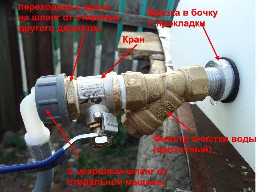 Далее, чтобы не перегружать насос, мы рекомендуем в нижнюю часть бочки врезать шаровый кран. Именно к нему и будет подключаться заборное отверстие агрегата. Патрубок, из которого под давлением будет нагнетаться вода, подключается к заливному шлангу.