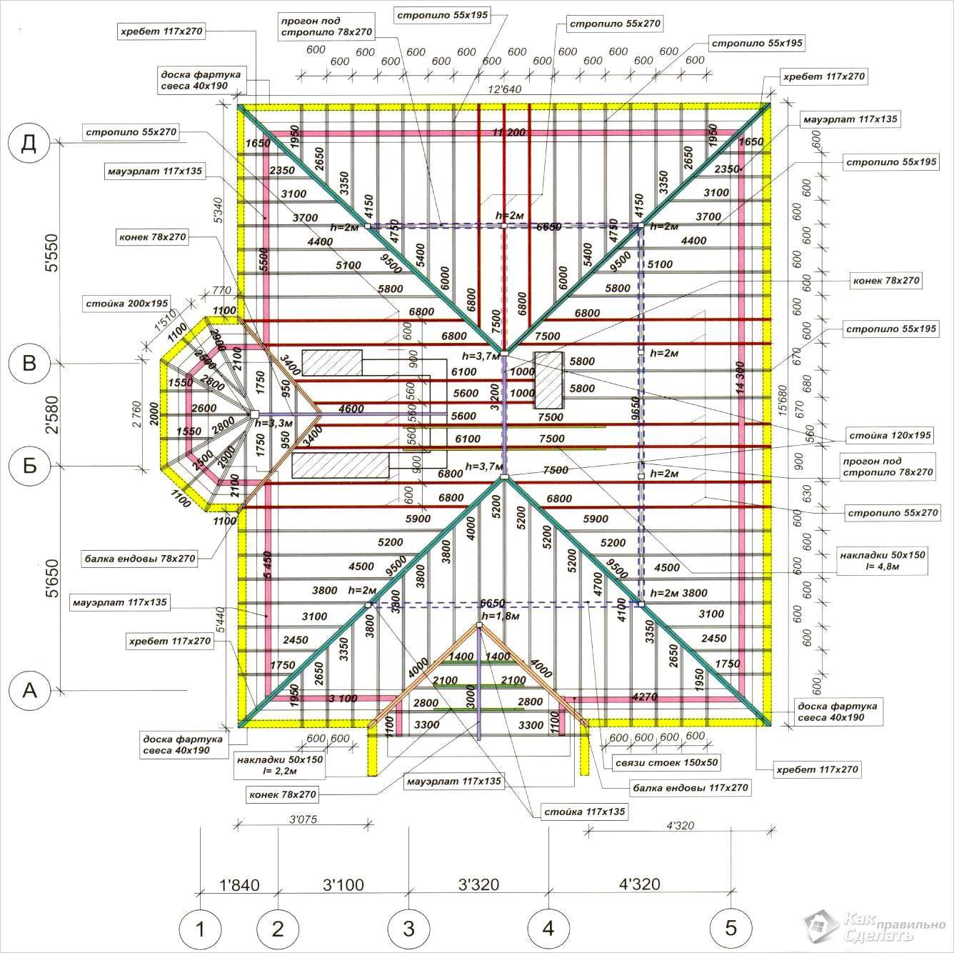При составлении чертежей стропильной системы четырехскатной крыши следует четко обозначить геометрическую форму, а также указать положение отдельных элементов и проекции скатов с точными размерами.