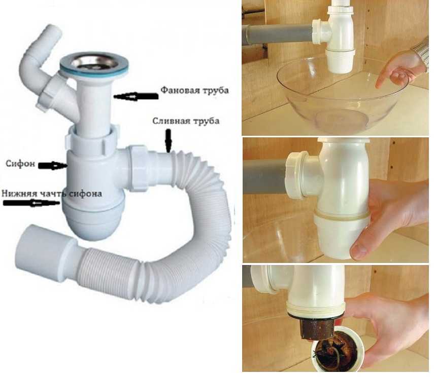 Как разобрать сифон на мойке смотрите на фото. Нижняя часть сифона откручивается — там обычная резьба. Перед тем, как откручивать, подставьте вниз какую-то емкость — стечет некоторое количество воды. Сняв нижнюю часть, вы увидите загрязнение. Вымыть надо и снятую часть и вычистить ту, что осталась на мойке — там, между стенками, скапливается приличное количество грязи. Все удаляем, очищаем.