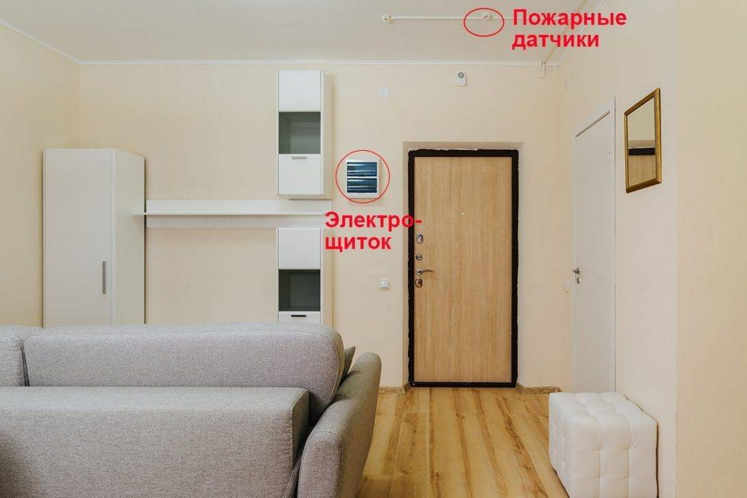 В районе двери должен быть электрощит с автоматами УЗО — устройств дифференциального тока из разных комнат, проще говоря, с небольшими рубильниками, а на потолке — пожарные датчики.