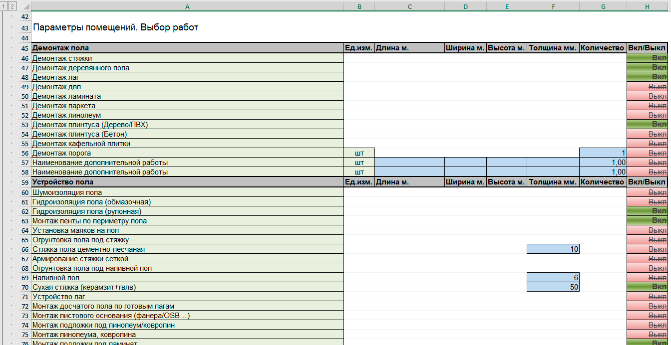 4. Параметры помещений. Выбор работ — в этом блоке просто включаем нужные работы и, если необходимо, указываем дополнительные размеры. Например, если хотим демонтировать старую стяжку, то просто включаем эту работу в разделе «Демонтаж пола». А если хотим залить стяжку, тогда в разделе «Устройство пола» включаем работу и указываем толщину стяжки. Список работ очень большой, от демонтажа полов, до электрики и сантехники. Все работы объединены в разделы.
