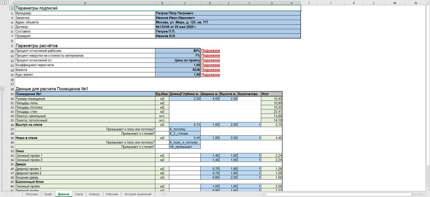 3. Данные для расчета помещения — тут указываются все размеры помещения. Для удобства, кстати, помещение можно переименовать, заменив название помещения в ячейке, залитой синим цветом. Так вот, указываем длину, ширину, высоту потолков, размеры окон и дверей и т.д.