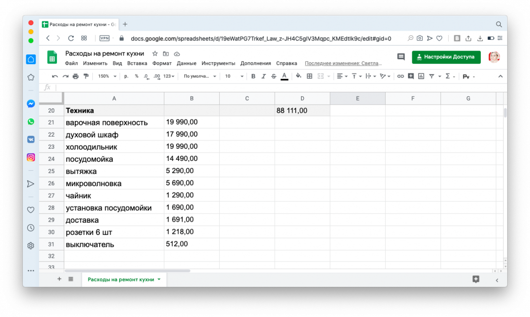 Получилось 280 886 рублей. Если дорого, можно скорректировать стоимость ремонта, например, не покупать новую технику и мебель, тогда получится 138 295 рублей. Или сделать всё самим без строителей, но купить новую плиту.