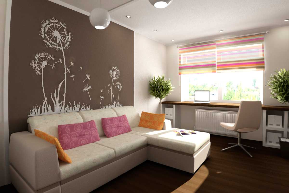 Следующим этапом является разделение зон. Современные дизайнеры предлагают зрительно разделить комнату на рабочую, гостевую, спальную и обеденную (при необходимости). Как правило центральное место в комнате отведено зоне отдыха. В нее входят диван и телевизор.