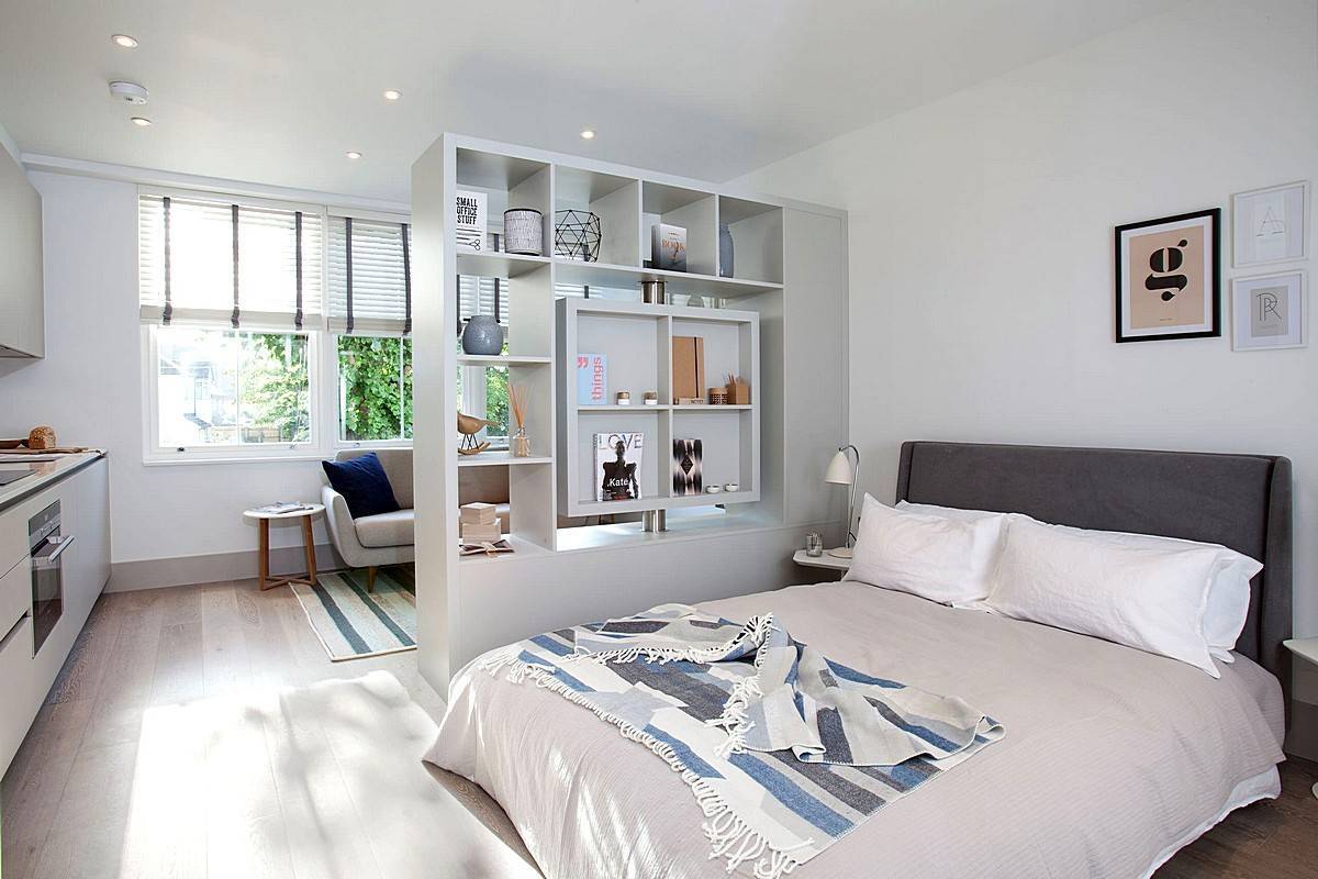 Если владельцем является один человек, который проводит много времени дома, в том числе там и работает, то комната должна быть разделена на спальную и рабочую зоны. В качестве перегородок отлично подойдут современные книжные полки.
