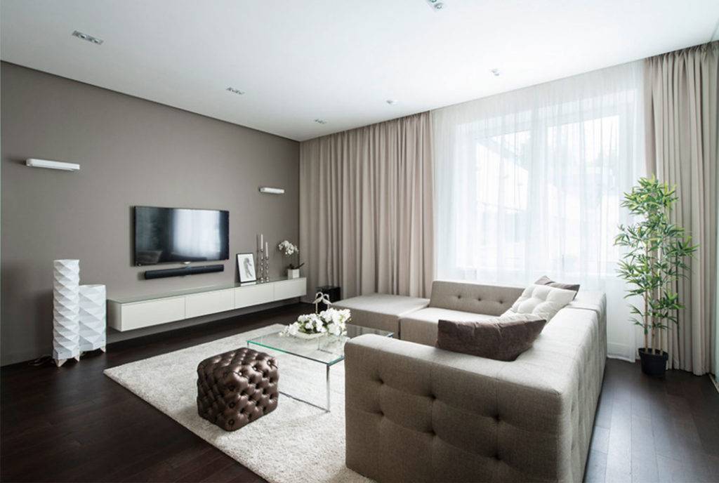 В современных залах допустимо использование темных красок. Однако обращаться к ним можно только в том случае, если в комнате присутствует много естественного и искусственного освещения.
