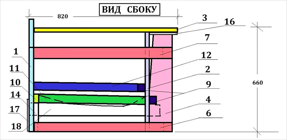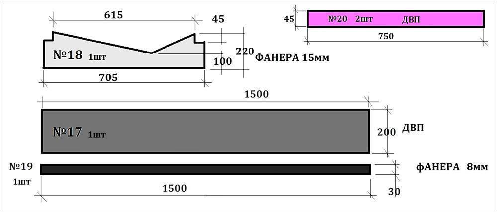 На следующем этапе создается подробная схема, которая включает составляющие детали, места расположения креплений, усиливающих элементов и перегородок внутренних ящиков для хранения.