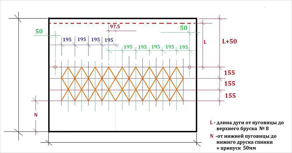 Сначала измерим расстояние от верхней пуговицы до бокового бруска. То же самое проделываем со спинкой – от пуговицы до заднего бруска. Также нужно замерить расстояние от передней стойки до первой верхней пуговицы на подлокотнике. Все эти размеры заносим в эскиз.