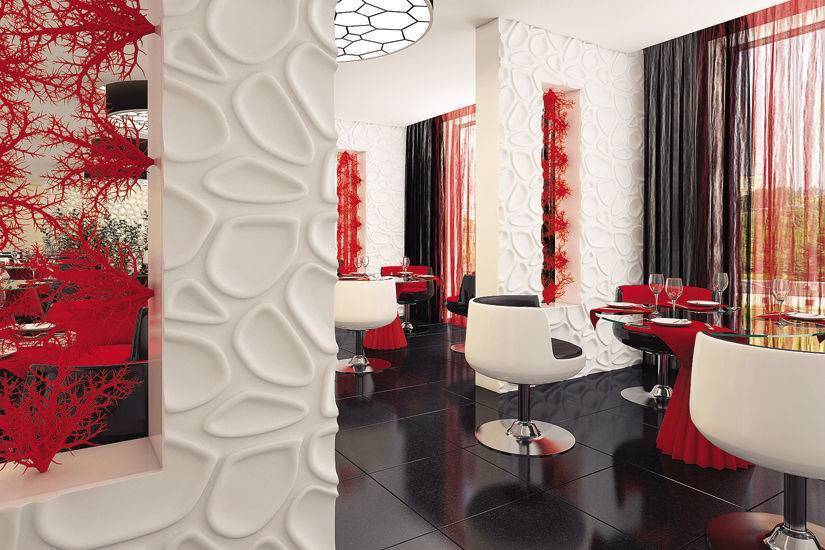 - Объемные панели. Как правило, их делают из гипса и украшают различными узорами. Этот материал придает стене объема и отлично декорирует помещение, позволяя делать его под любое настроение.