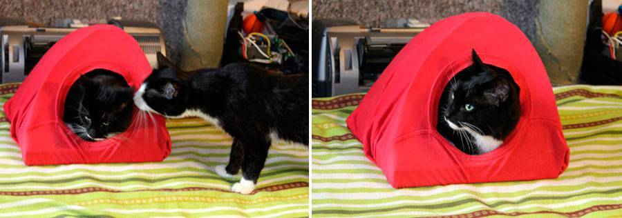 - Этот вариант очень удобен в том случае, если жилье временное, и вы не готовы приобретать домик для кота за приличные деньги. Такой домик требует минимального количества времени, при необходимости футболку можно снять и постирать.