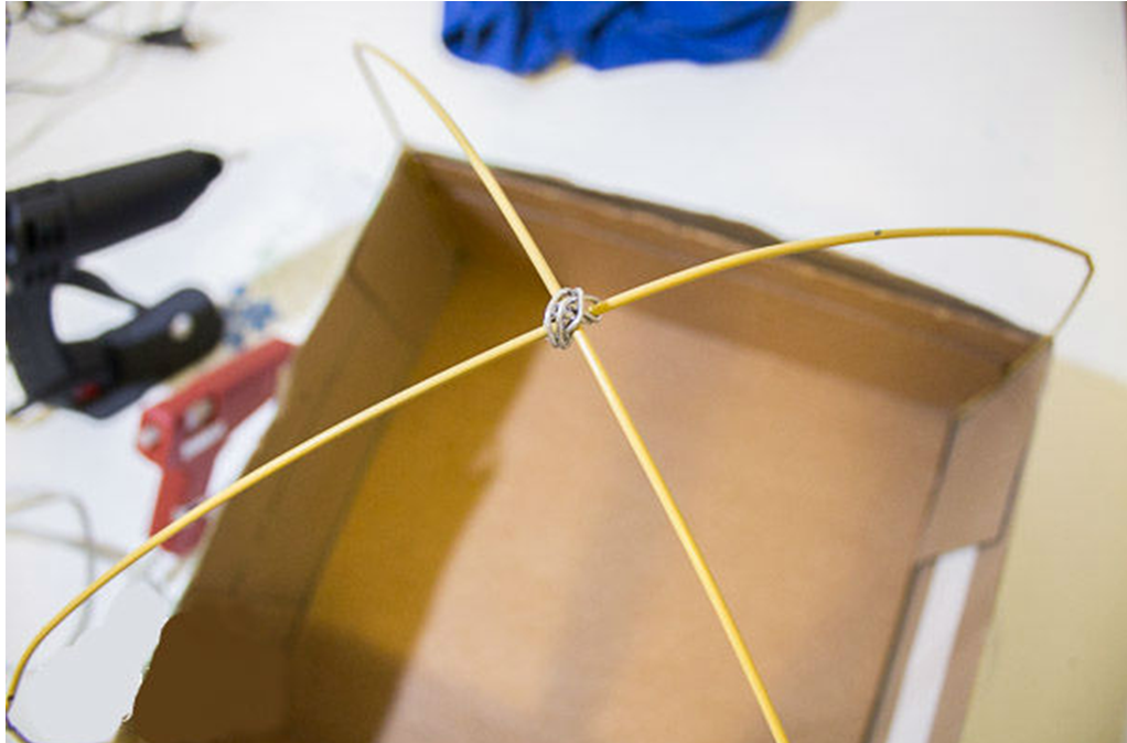 - Вставьте провода в отверстия, пересекая их по диагонали – так, чтобы они пересеклись в центре коробки. Сформируйте провода таким образом, чтобы вместе они образовали куполообразную форму. На пересечении проволокой или скотчем следует скрепить проволоку, чтобы крыша была прочной. Каркас готов, можно приступать к заключительному этапу работ.
