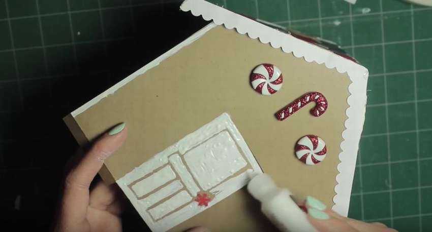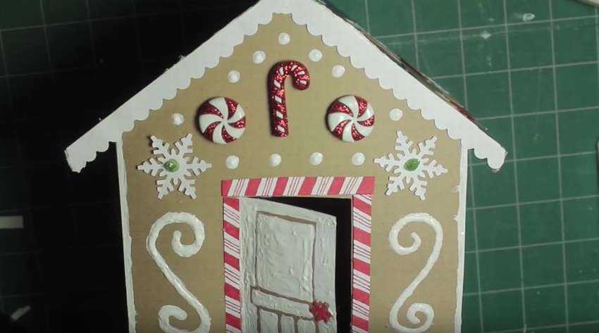 Новогодний домик обычно раскрашивается вручную – имитирует бревенчатую избушку, кирпичное строение. Крышу оформляют снегом из ваты, синтепона, белого фетра. Подложку-полянку, на которой стоит дом, выполняют из такого же материала. Интересно смотрится домик из простого гофрокартона, на крыше которого прорисованы белой краской контуры дверей, окон, черепица. Если дом планируется сделать элементом зимней композиции, окружающую обстановку для него лепят из полимерной глины, соленого теста, бумаги. Здесь можно вылепить или вырезать елочки, собачью будку, фигурки лесных жителей. Так как «картина» зимняя, белая либо серебряная краска в баллончике, для декорирования многих деталей придется весьма кстати.