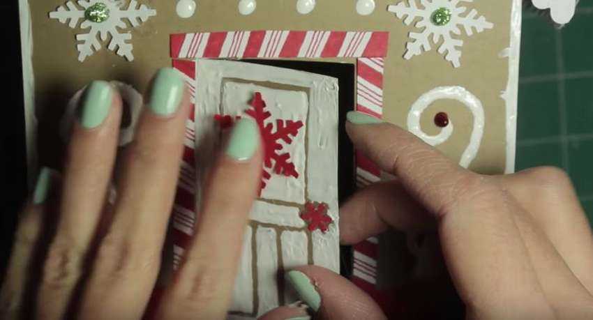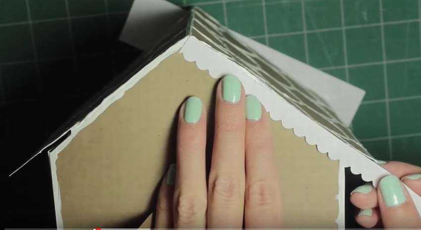 - Чтобы сделать на двери щеколду, вырежьте из картона прямоугольник и приклейте малярным двухсторонним скотчем к краю двери. Крышу можно украсить черепицей, изготовив ее из квадратиков коричневого или зеленого цвета.