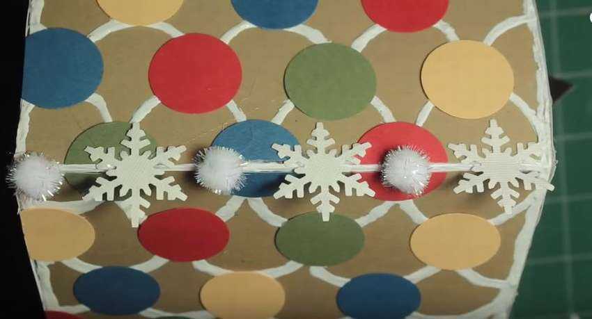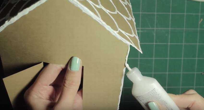 Начинать клеить черепицу нужно снизу в шахматном порядке. Промазывайте клеем только половину квадратика и делайте внахлест каждый ряд — так до самого верха. Крышу можно украсить снегом из ваты, приклеив ее на клей ПВА.