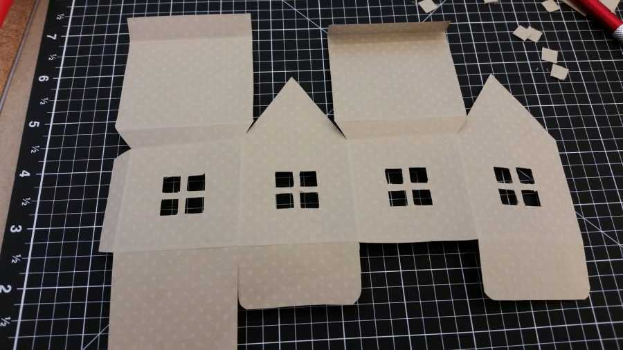 - Вырежьте квадраты для окон, используя канцелярский нож.
