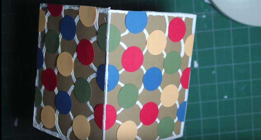 ![]() | На чертеже соединяются 2 коробки без отверстий. Нужно «прихватить» в нескольких местах середину, чтобы после склеивания картон не сдвинулся. |