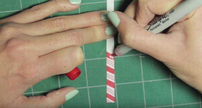 - Отметьте на маленькой коробке места, которые нужно отрезать, чтобы труба ровно легла на крышу дома. Чтобы было проще это сделать, прислоните коробочку к крыше ровно сбоку и карандашом проведите линии. Когда приклеите трубу к крыше, можно накрыть ее картонной крышкой и приклеить картонный цилиндр от туалетной бумаги.