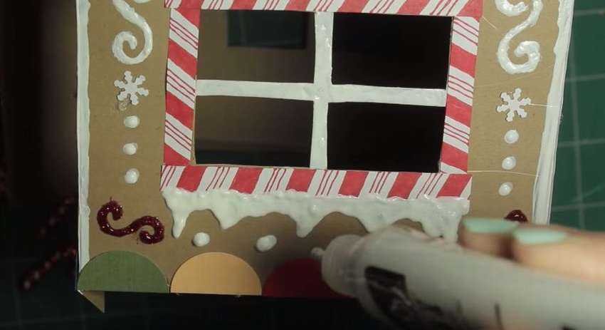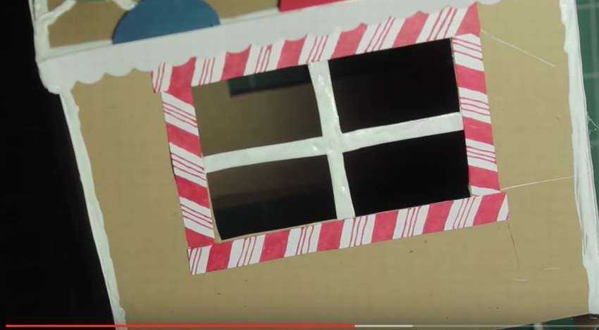 - Для окон можете вырезать 2 широкие картонные полоски, и приклеить их к окну. Также можно вырезать несколько полосок для создания оконной рамы.