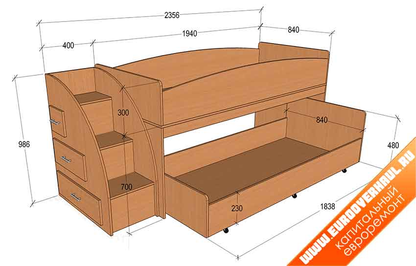 Конструкция с выдвигающимся ярусом может быть представлена в нескольких вариантах. У раздвижной двухъярусной кровати из ДСП своими руками ярусы надежно скреплены между собой. У такой кровати-трансформера вперед, вправо или влево выдвигается нижний ярус со спальным местом. Данная конструкция выполняется высотой 60-80 см. Изделие может представлять собой традиционную двухуровневую модель с лестницей, у которой под нижней кроватью выдвигается еще одно спальное место.