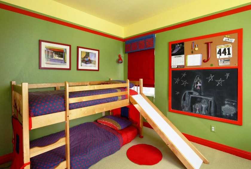 Двухъярусная кровать позволяет разместить двоих детей в одной комнате. Благодаря ей остается достаточно места для игр и занятий.
