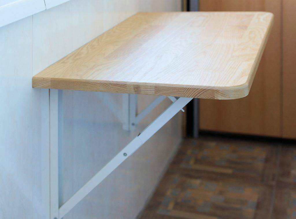 на подвесной каркас устанавливают столешницу. Крепление к стене производят мебельными петлями на саморезах. Раскладной элемент располагают так, чтобы он отступал от стены на толщину вертикальной основы. Свободный промежуток закрывают тонкой планкой из дерева.