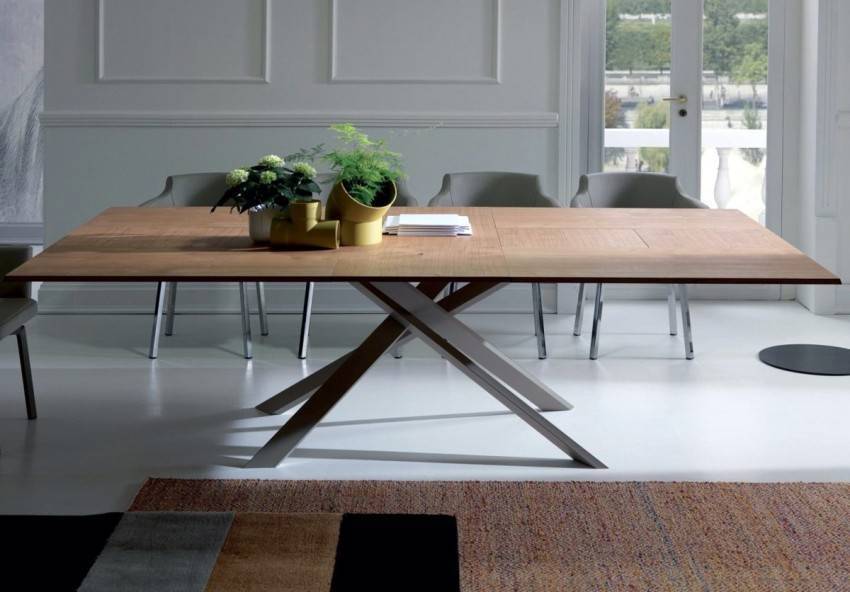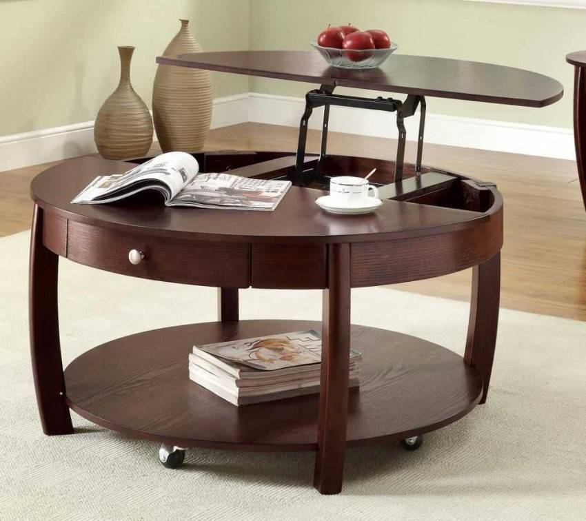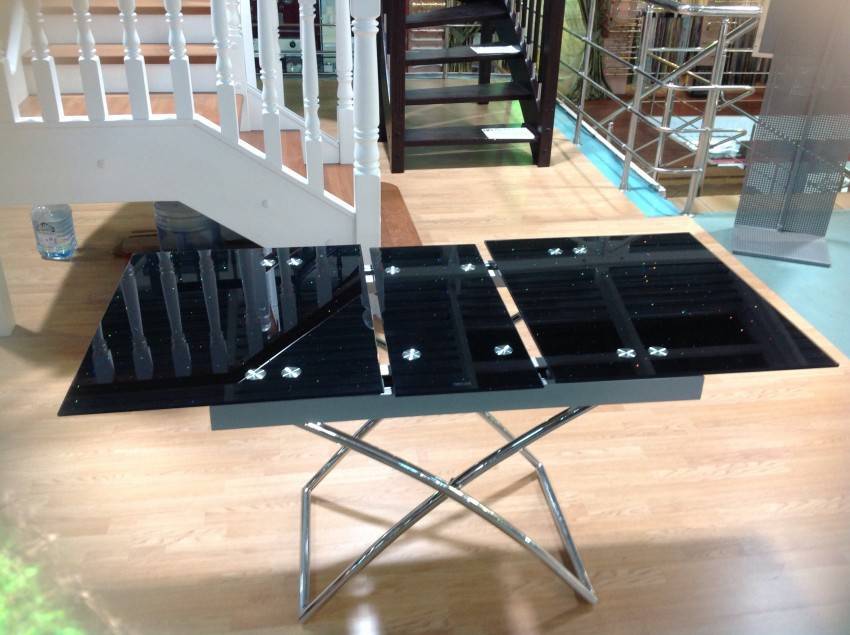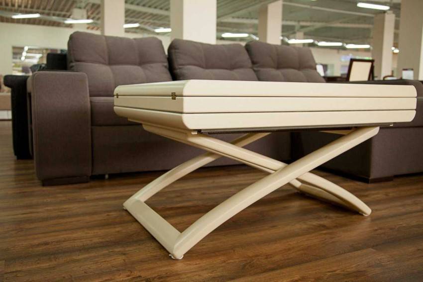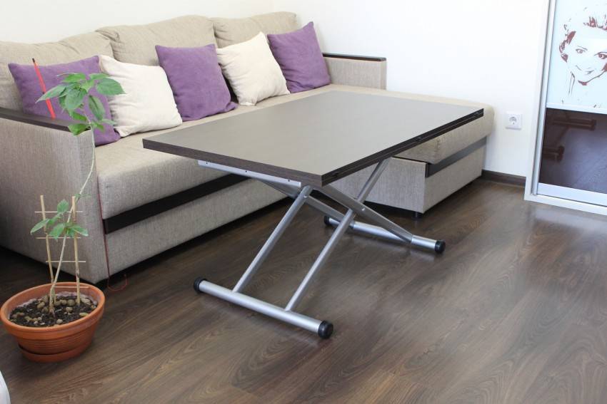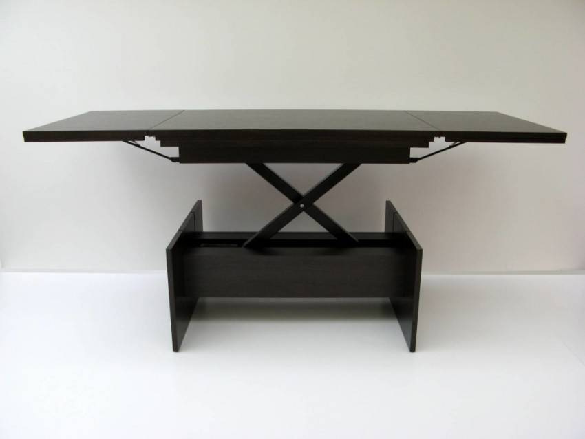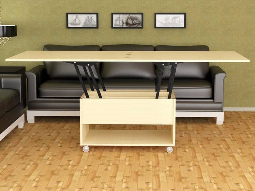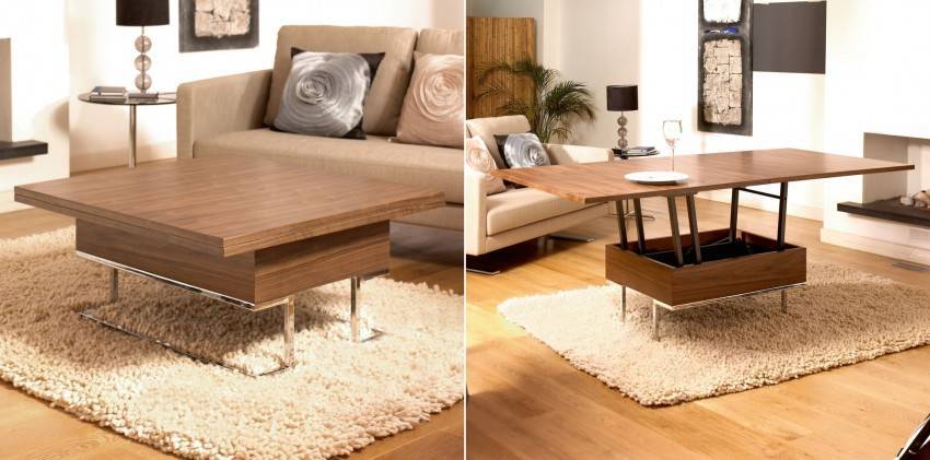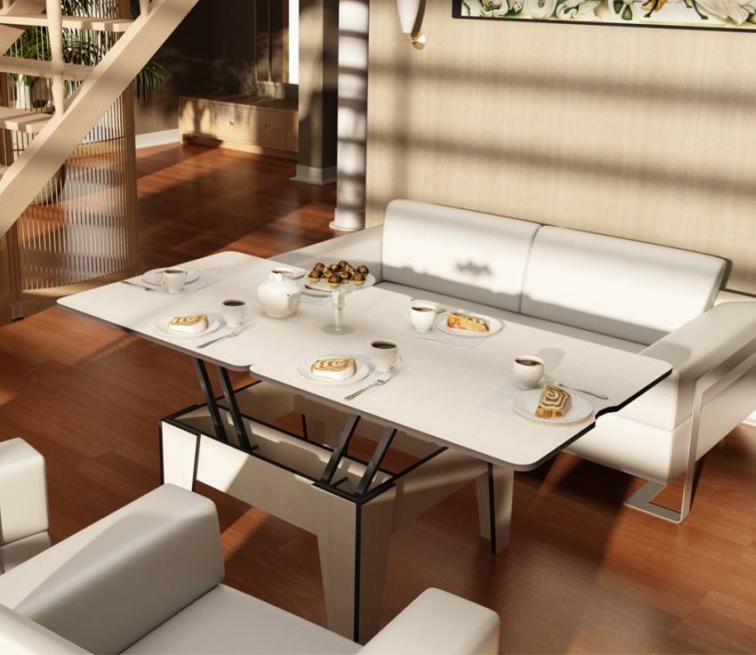 - раскладные журнальные столики, располагающиеся в гостиной. Благодаря данного рода столам легко объединить обеденную и гостиную зоны, сохранив функциональность помещения. Недостатками такого стола можно считать большой вес и высокую стоимость. Как правило, в качестве раскладной системы используется механизм, превышающий общую стоимость материалов в несколько раз;