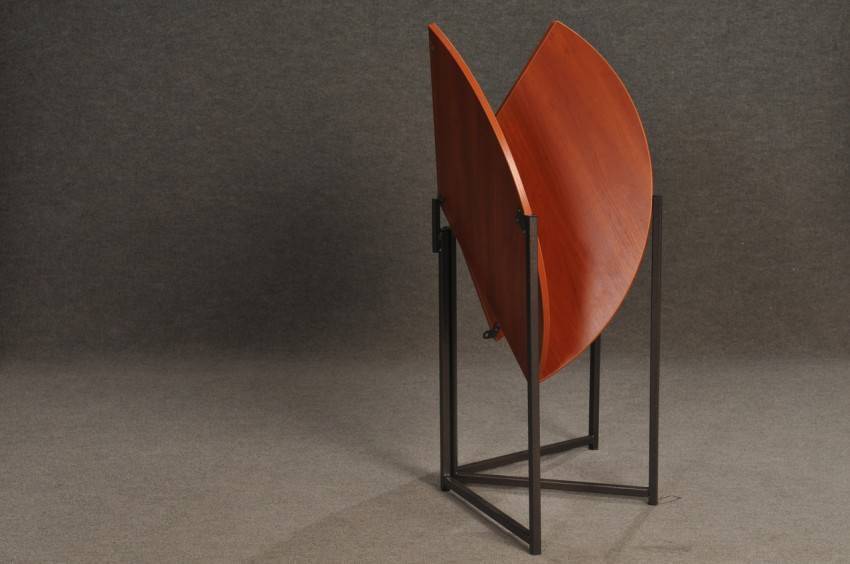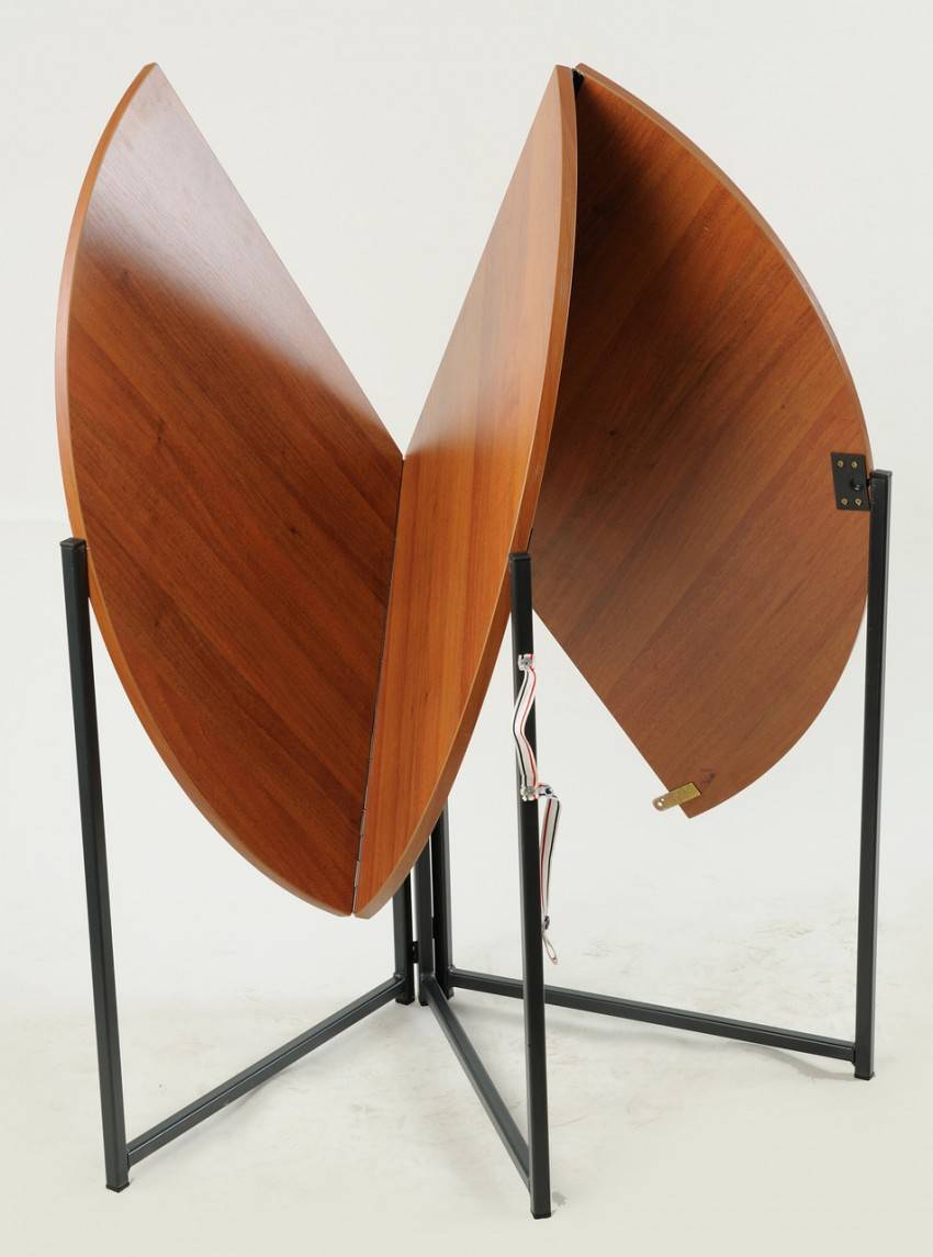 Эта ретроразновидность чем-то напоминает приставные столы-трансформеры, но имеет одно принципиальное отличие: размеры столешницы можно регулировать. Полностью привести изделие в вертикальное положение невозможно. В сложенном виде конструкция занимает меньше пространства, превращается в удобную тумбу. Подобный вариант часто используется на балконах и в очень маленьких кухнях. Главное преимущество заключается в компактности, универсальности, но конструкция получается достаточно хрупкой, из-за чего ее не рекомендуется заставлять тяжелыми предметами.