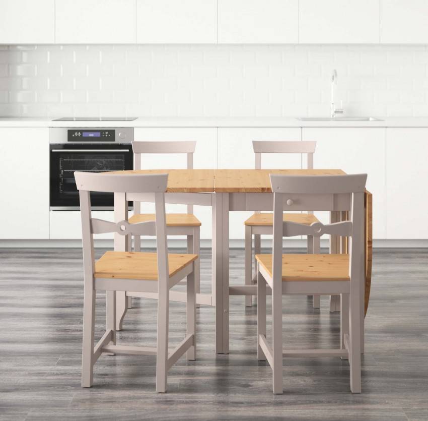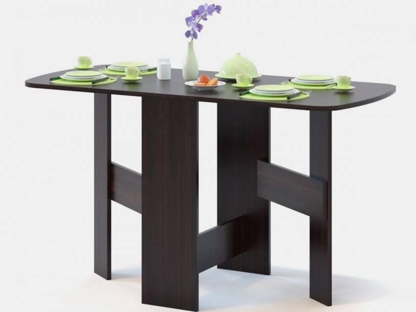 Такой вариант отличается максимально компактными размерами и многофункциональностью. Он очень удобен в эксплуатации, а поднятие столешницы и складывание не занимает много времени. Откидной столик на кухню часто покупают владельцы хрущевок. Мебель отлично вписывается в интерьер подобного помещения, может иметь полукруглую или прямоугольную форму, занимает минимум пространства.