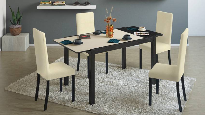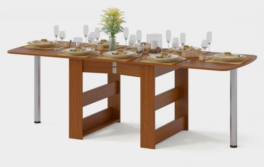 Раскладной стол не зря называют «книжкой» — принцип раскладывания действительно напоминает распахивание «обложек» книги в перевернутом виде. Основное преимущество очевидно: в собранном виде стол-тумба занимает совсем мало места, а в разложенном – способен с комфортом разместить шесть-восемь человек.