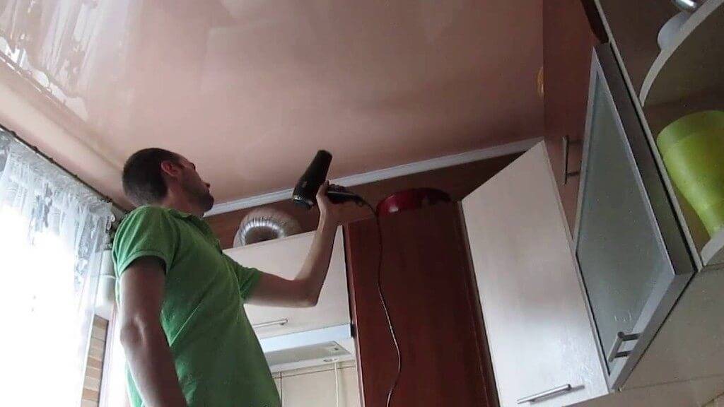 Некоторые источники советуют самостоятельно заняться просушкой с помощью промышленного, либо мощного бытового фена — не стоит. Если с тканевым потолком такой трюк еще может сработать (но сушить придется очень долго), в случае ПВХ-пленки эти действия абсолютно бесполезны.