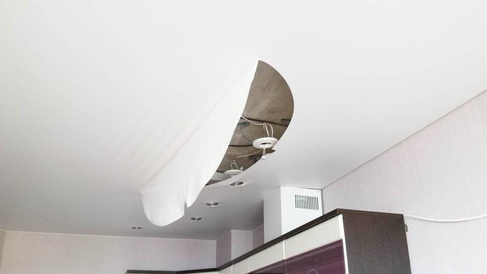 Чаще всего компании, осуществляющие монтаж натяжного потолка, дают гарантию на покрытие. Поэтому можно связаться с ними. Они не только устранят последствия потопа, но и сделают скидку на ремонтные работы, вернув полотну прежний вид.
