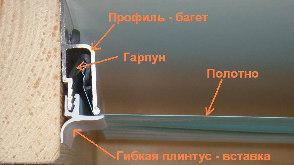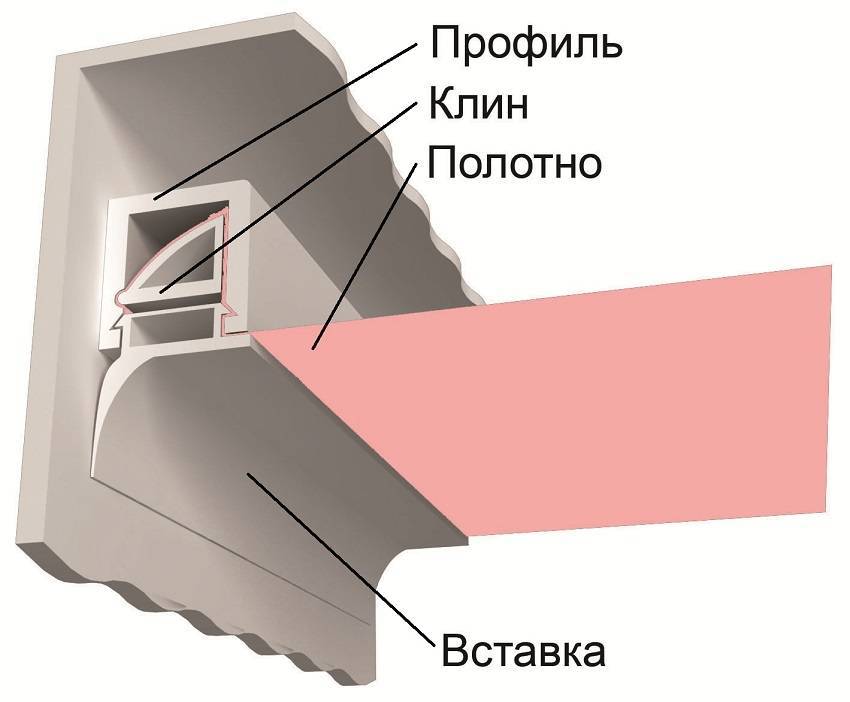 Натяжной потолок — это конструкция из специального полотнища, закреплённая под основным потолком. Для фиксации отделочного материала обычно используют алюминиевые либо пластиковые багеты, закрепляемые при помощи дюбелей по периметру комнаты. Зазоры между сопряжением полотна со стенами скрывают декоративной пластиковой накладкой из ПВХ.