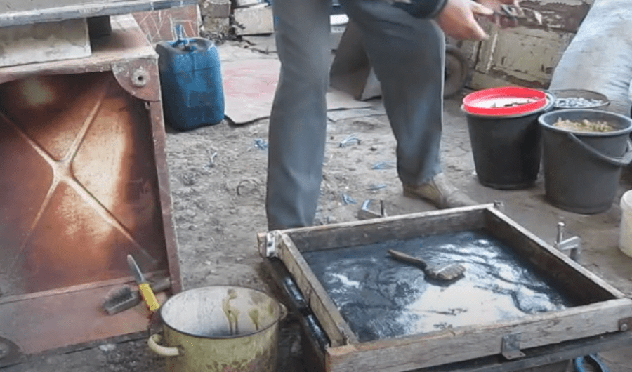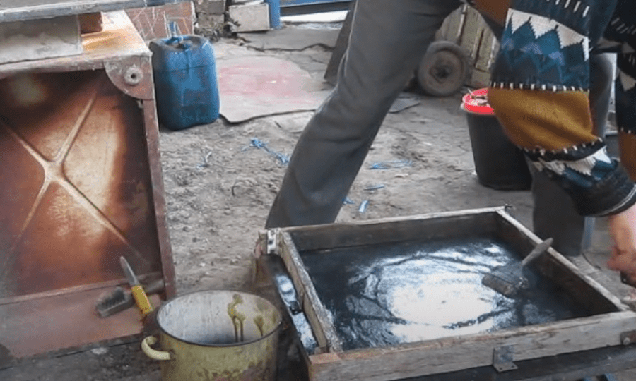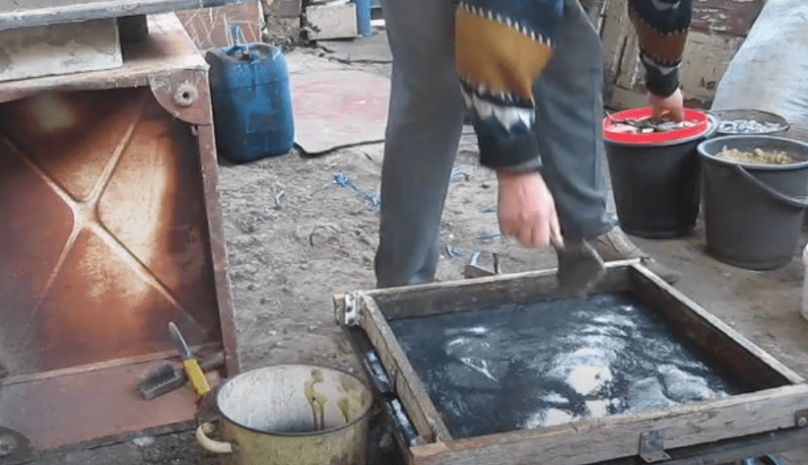 - вибролитье. Раствор засыпается в формы, впоследствии устанавливаемые на вибростол. Вибрация уплотняет бетон, выгоняя из него воздух. Такая плитка подходит для укладки во дворе частного дома. Стоит относительно дешево. Может изготавливаться в кустарных условиях. Недостаток: в мороз даже слегка влажная плитка становится скользкой, ее обязательно нужно посыпать песком;