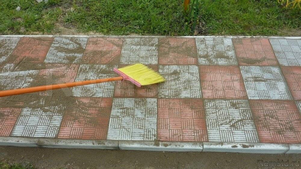 Между брусчаткой швы засыпают сухой ЦПС и проливают водой. Операцию повторяют до тех пор, пока смесь не перестанет усаживаться. Через 2–3 суток, когда поверхность окончательно высохнет, убирают строительный мусор, веником сметают мелкий сор и пыль и, при необходимости, промывают поверхность сильным напором воды из шланга.