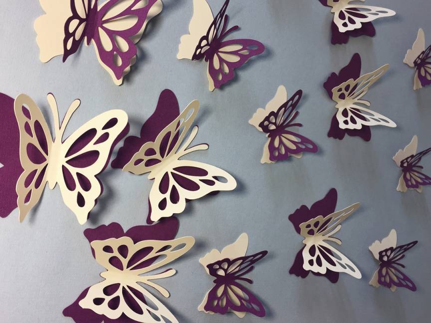 Чтобы не портить стену, можно подвесить бабочек за нитки к потолку. Рекомендуется вешать бабочек на нити разной длины. Можно использовать как цветные нити, так и прозрачную леску. Главное – нитка должна выдерживать украшения.
