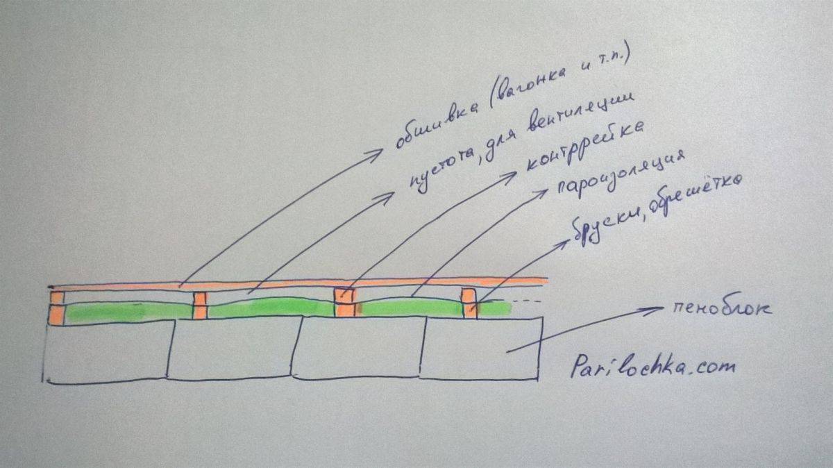 Тем не менее, вот схема пирога внутреннего утепления бани из пеноблоков: