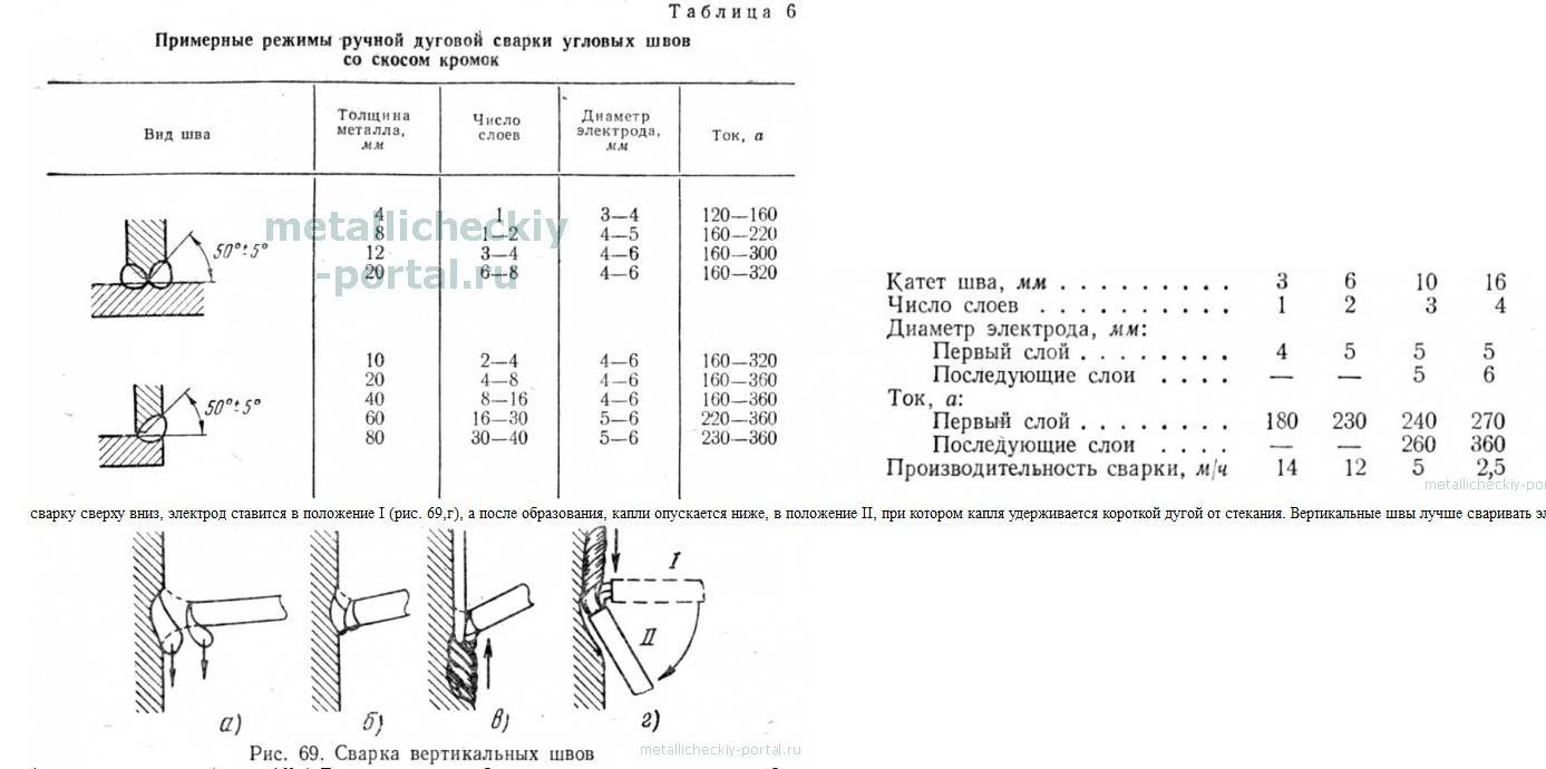 Чтобы определить количество проходов, учитывают размер площади поперечного сечения, имеющегося шва. Обычно эта величина равна 30—40 кв. миллиметров. Рисунок 68 г наглядно показывает, как должны выглядеть угловые швы с разным количеством слоев, имеющие разделку кромок, полностью проваренные.