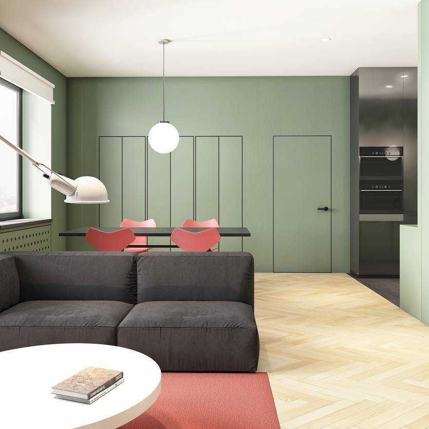 Эта расцветка представляет собой сочетание современности, свежести и спокойствия, исходящего от природы. Интерьеры таким образом станут оригинальными и неповторимыми. Помните, что не только стены могут быть подчеркнуты сильными цветовыми акцентами, сделайте также ставку на изменения аксессуаров, мягкой мебели или фасадов шкафов.