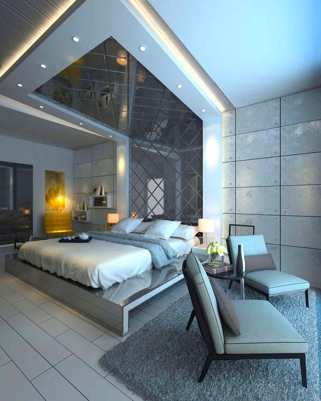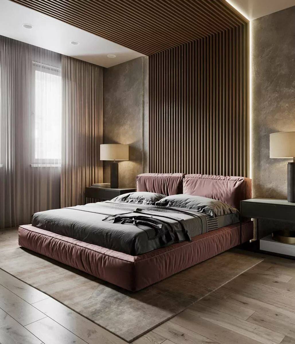 Спальня с кроватью у стены и с широкими полками для мелочей интерьераИсточник www.archilovers.com
