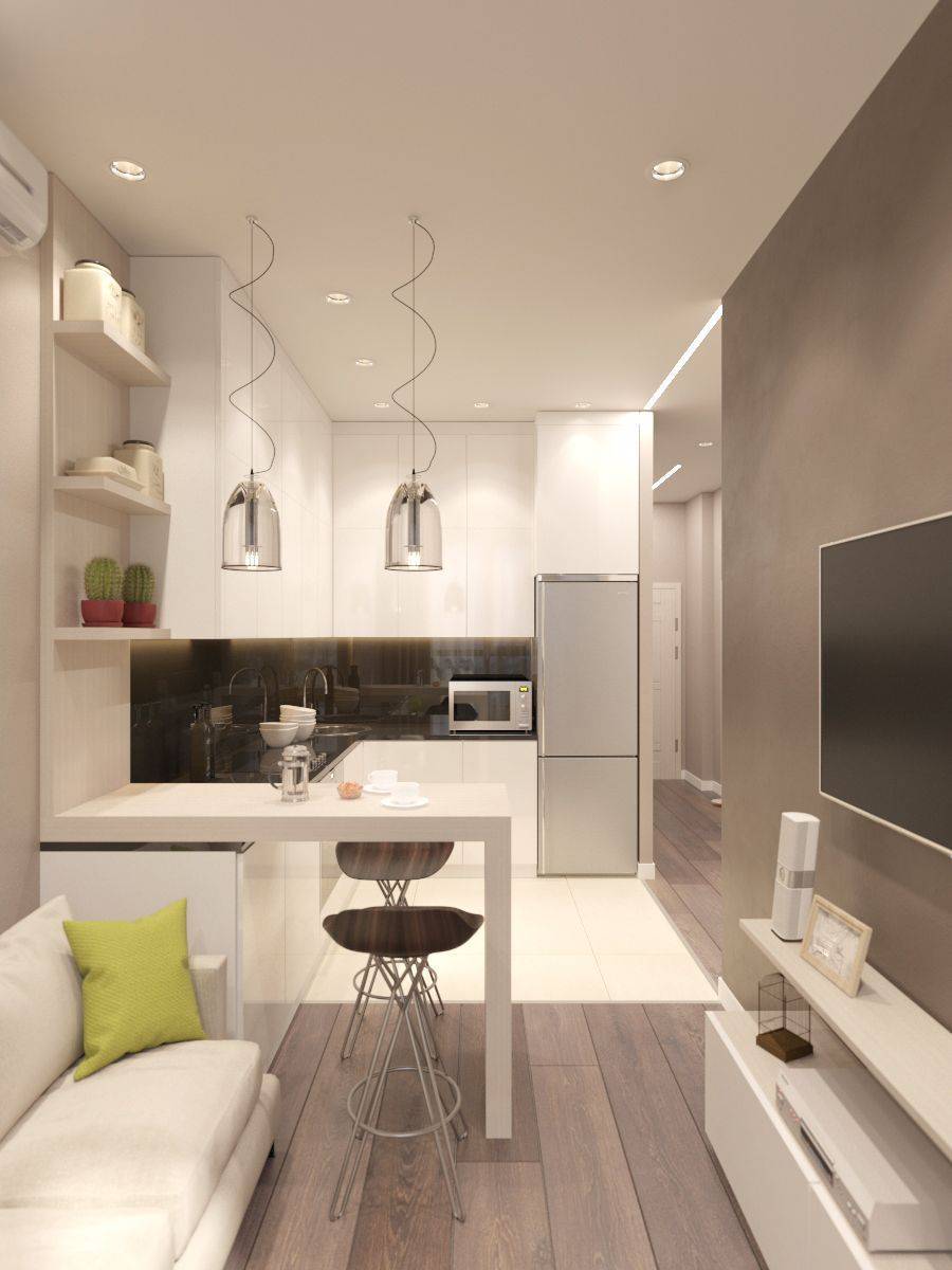 При оформлении маленьких комнат рекомендуется задействовать места под кроватью, столом, диваном, кухонным уголком. Вместо тумбочек используют настенные полки. Удачный вариант – подиум, на котором располагается спальное место, а под ним – место для хранения вещей.