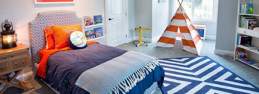 Ковровое покрытие в детской должно быть, прежде всего, тёплым и приятным на ощупь, также ещё один важный критерий – гипоаллергенность и простота в чистке, потому плотный и длинный ворс лучше исключить. Расцветка ковра зависит от возраста ребёнка, а также его личных предпочтений – для совсем малышей лучше выбирать ковры спокойных тонов с крупным геометрическим рисунком.