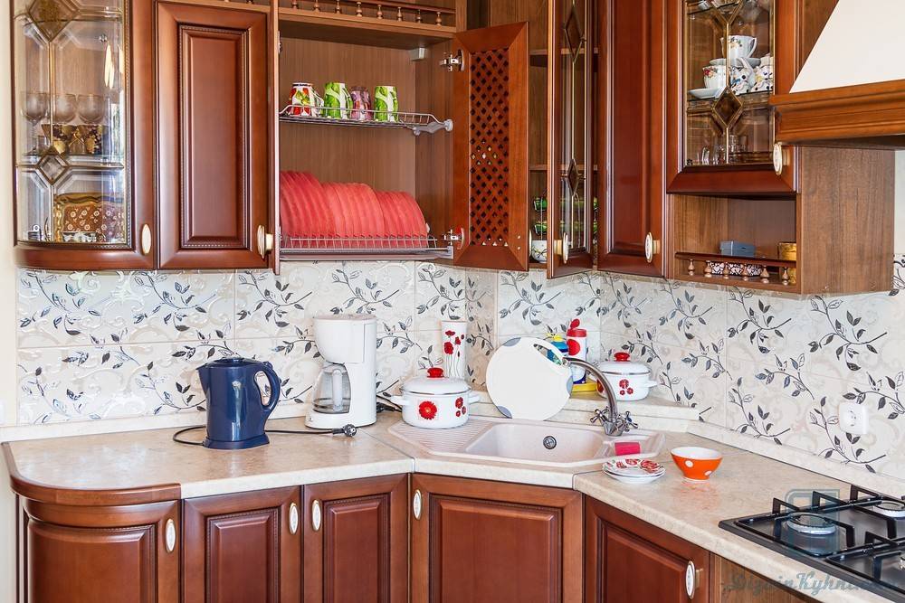 - Сушка для посуды. Располагается прямо над раковиной, «прячется» за фасадными дверцами для эстетичности. Наличие поддона не обязательно, иногда отсек не имеет дна и вода стекает прямо в раковину.