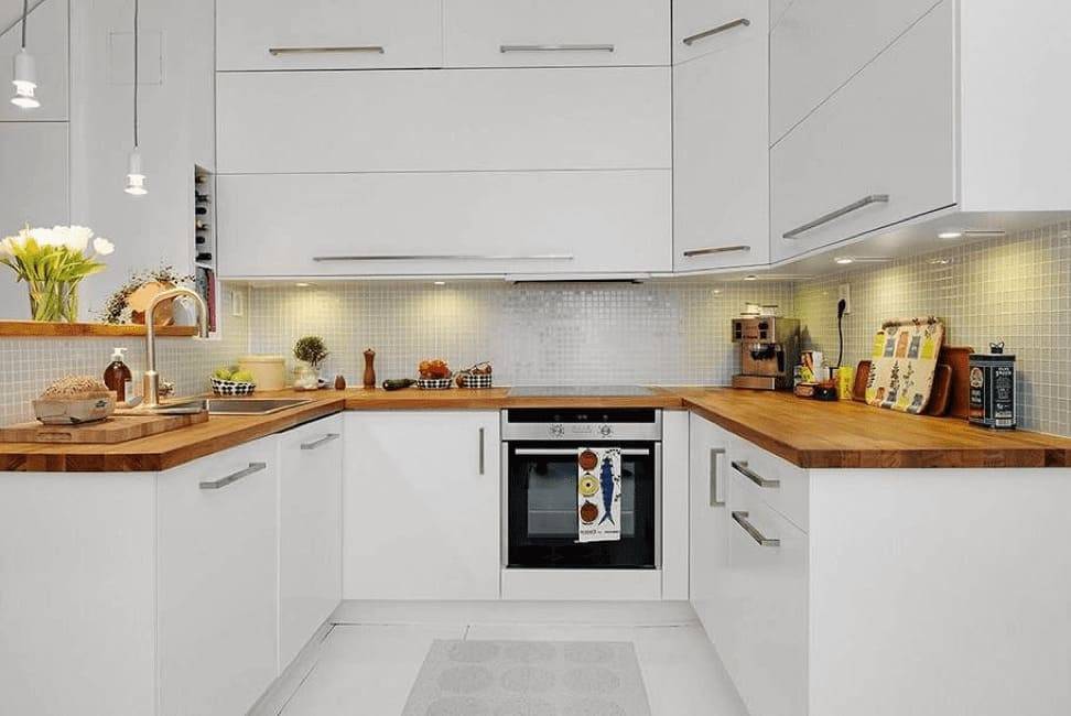 Другая популярная композиция – это U-образная форма, в которой на обеих противоположных стенах установлены шкафы. Обычно они связаны между собой кухонной стойкой , которая расположена у окна. Этот тип устройства небольшой кухни может быть немного смущающим из-за значительного сокращения полезного пространства.