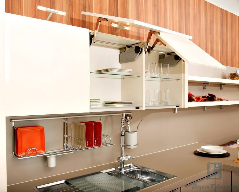 Модные шкафчики с вертикальным подъемным механизмом удобны, но не всегда. Учитывайте, что чаще всего дверца поднимается выше гарнитура, поэтому на кухнях с низкими стенами вы можете повредить ее, а в редких случаях — еще и потолок. Качественный вертикальный подъемный механизм может работать без перебоев до 15 лет
