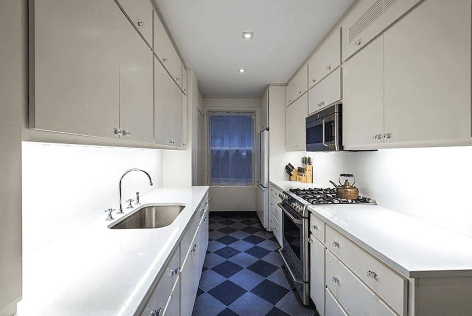 Кухня идеально впишется в узкое и малогабаритное помещение от 6 до 12 м2, ширина которого менее 2 м. В таком варианте предусматривают выдвижную систему для посуды, навесные шкафы – для продуктов. Чтобы не загружать пространство, покупают встраиваемую технику, между холодильником, мойкой и плитой располагают рабочие столы, на противоположной стороне размещают складной или пристенный, откидной стол.